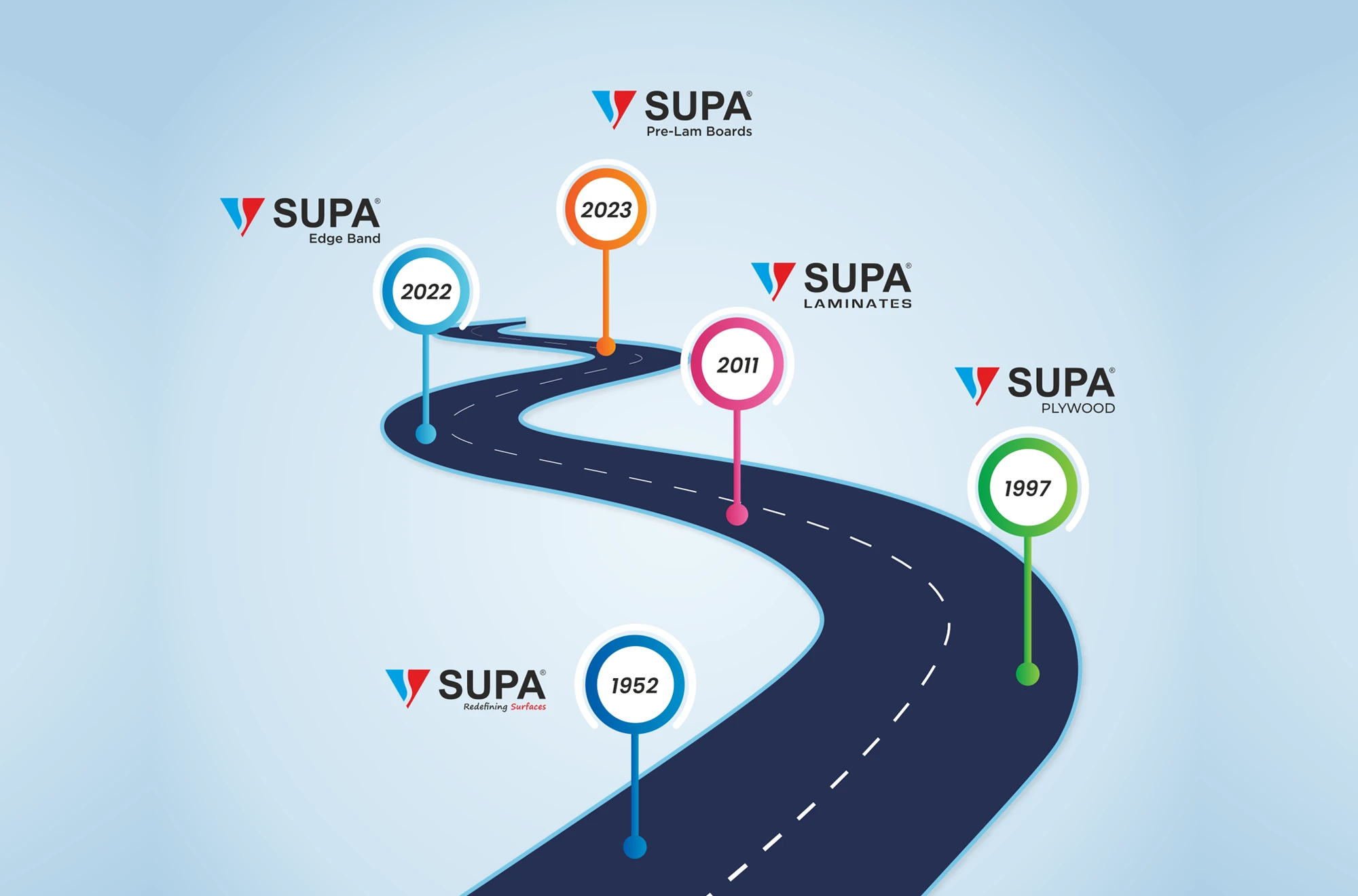 Since 1952, Supa has evolved into a diversified group, committed to excellence in surface solutions. From plywood and laminates to edge bands and pre-lam boards, every milestone reflects our dedication to quality and forward thinking.